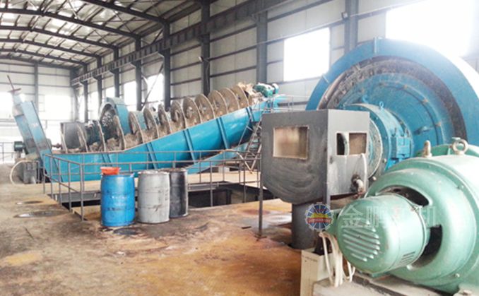 本工藝采用兩段一閉路破碎流程,合格產品進入粉礦倉緩存,礦石由擺式給礦機均勻的給到直筒節能格子型球磨機進行磨礦,格子球磨機和高堰式單螺旋分級組成一段閉路磨礦分級流程。球磨機的排礦先經過跳汰機富集大顆粒金,跳汰機底流通過兩段搖床選出30%品位的顆粒金,跳汰機的溢流進入分級機。分級溢流經過攪拌槽的調漿后進入浮選系統,通過做礦石的可選性實驗研究我們選擇一粗三精三掃的浮選流程,從而很大程度的回收脈石中的有價金元素。浮選金精礦通過濃密機濃縮由過濾機完成脫水作業,浮選尾礦由濃密機濃縮后進入壓濾機進行壓濾成濾餅做到尾礦干排。金礦重浮聯合流程也是金鵬集團用于山東黃金集團蓬萊大柳行選廠項目中的成功經驗。