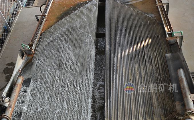 礦粒群從6s搖床床面上角的給礦槽送入,同時由給水槽供給橫向沖洗水,于是礦粒在重力,橫向流水沖力,床面作往復不對稱運動所產(chǎn)生的慣性和摩擦力的作用下,按比重和粒度分層,并沿床面作縱向運動和沿傾斜床面作橫向運動。比重和粒度不同的礦粒沿著各自的運動方向逐漸扇形流下,分別從搖床精礦端和尾礦側的不同區(qū)排出,最后被分成精礦,中礦和尾礦。